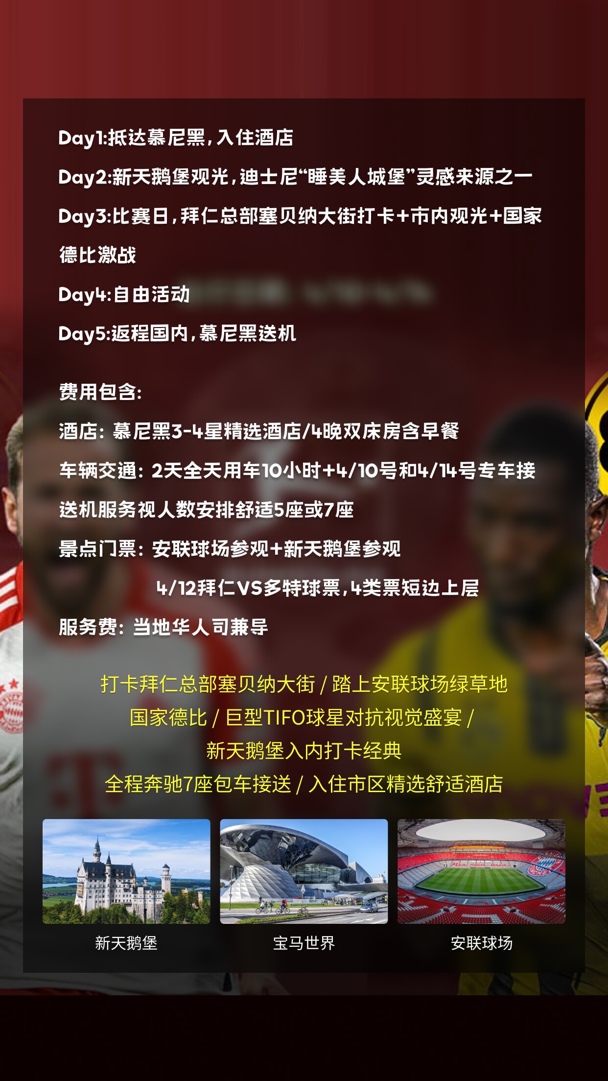 | 景点门票 | 安联球场参观+新天鹅堡参观 |